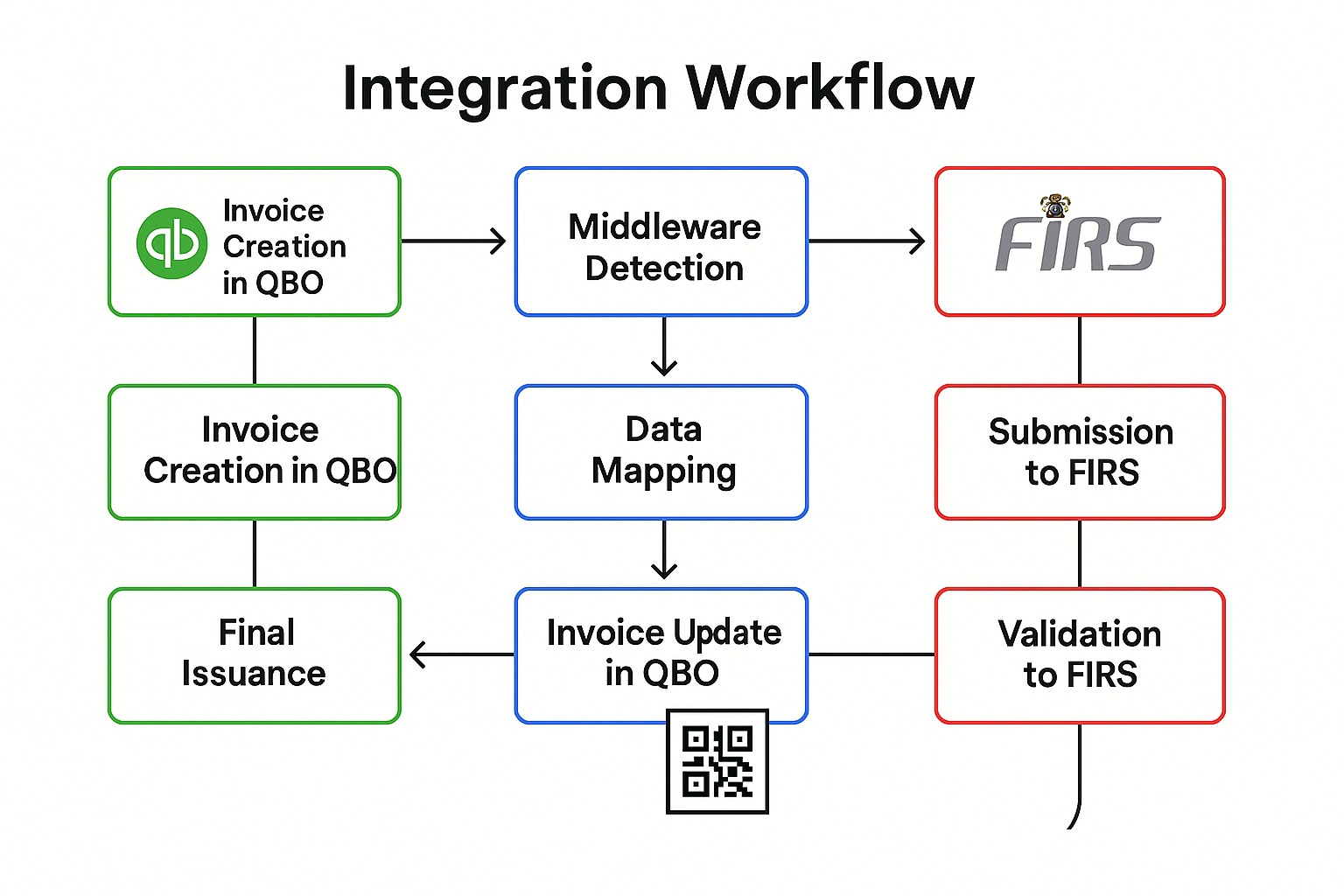 QuickBooks Online does not natively support Nigeria’s e-invoicing requirements. Therefore, integration must be achieved through: