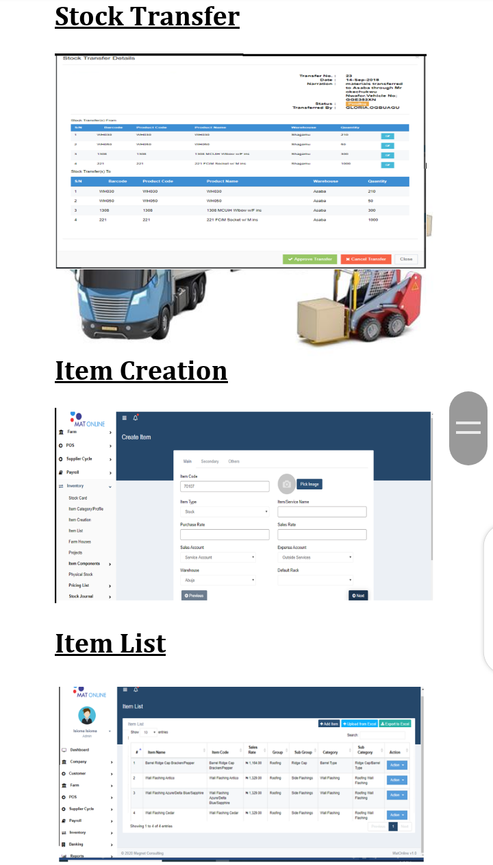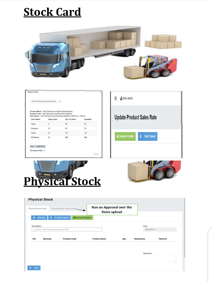 *Multi-Location stocking, LPOs, Material receipts, stock replenishment, stock transfers, physical stock (stock count and stock variance), stock adjustment, item categories, price levels and price lists, Barcode tracking, multi- level BOM etc, and sales and delivery.Our application is very simple to use, flexible and affordable: Request for a demo now….